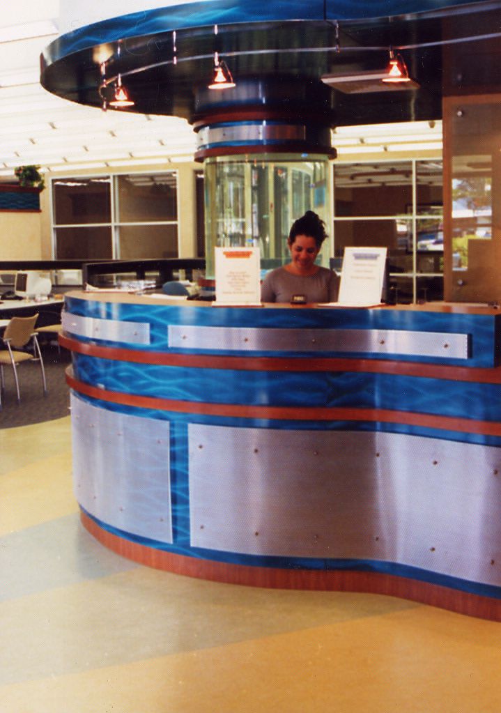 Plastic Laminate, wood veneer panels, cheery molding, stainless steel and lacquer finish blue steel panels